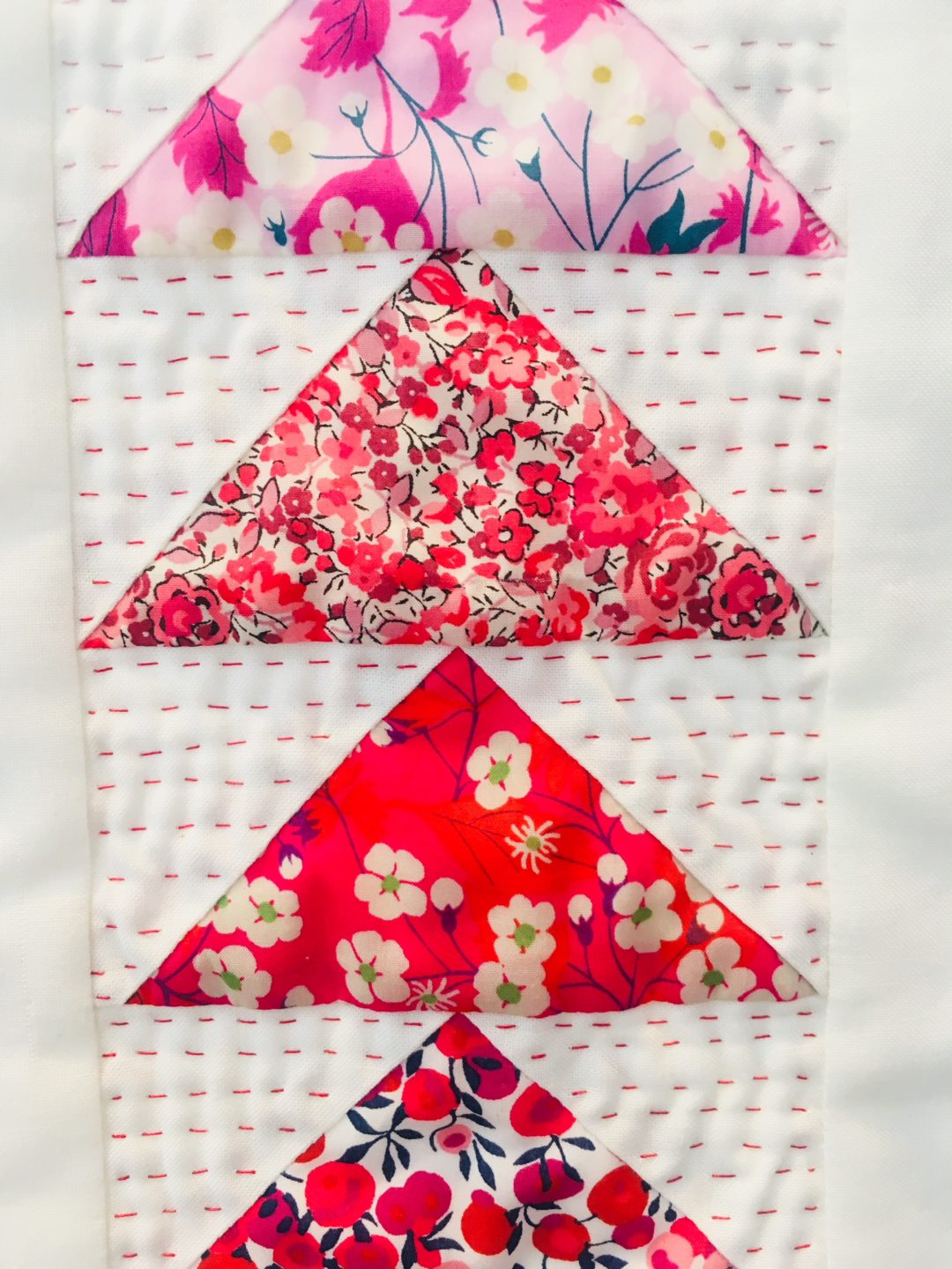 You may have seen me in the shop working on this little poppet- a display to show off our beautiful Liberty charm packs. The Liberty tana lawn was a dream to work within I just love these prints.  I used two 5″ charm packets make this crib sized quilt and two metres of white cotton. I hand stitched using Gütterman quilting thread in matching colours.