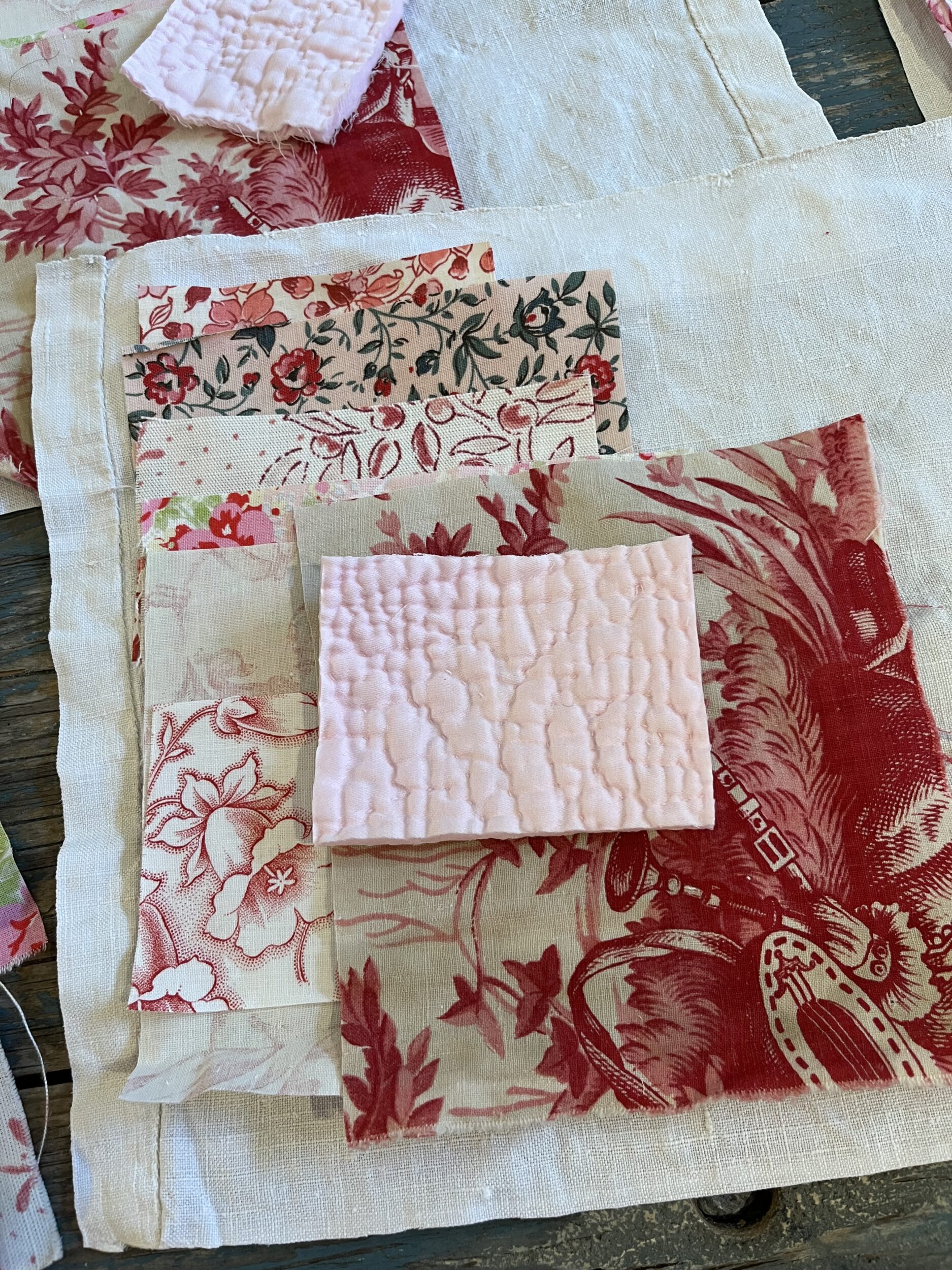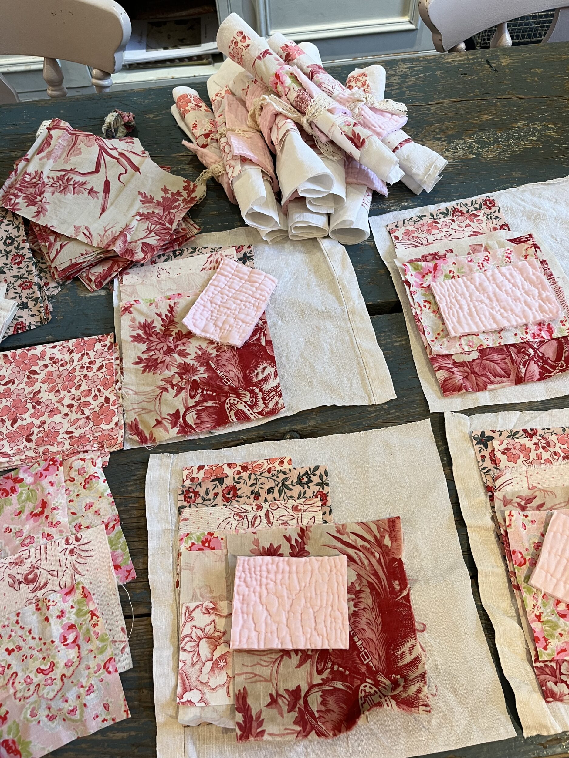Each of these beautiful bundles contains vintage pieces, perfect for a slow stitch project. The bundle includes antique linens, paisleys, florals and toile-a lucky dip from the fabrics included in the photos.
